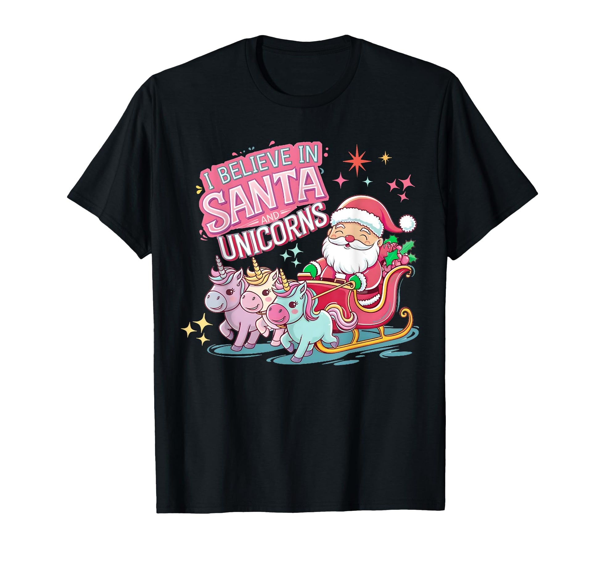Christmas I Believe In Santa And Unicorns Funny Xmas Pajama T-Shirt