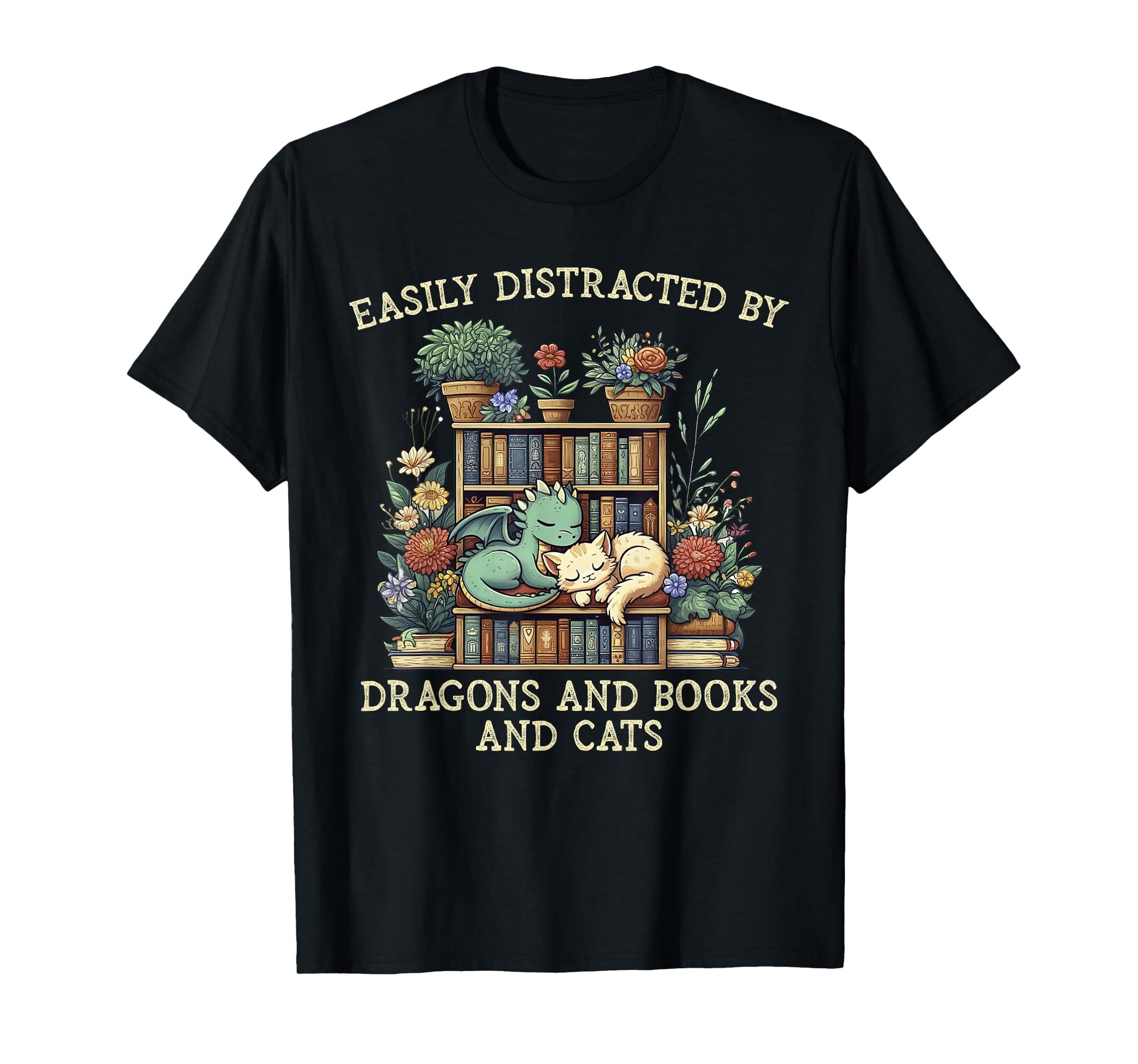 Easily Distracted By Dragons Books Cats Fantasy Book Lover T-Shirt