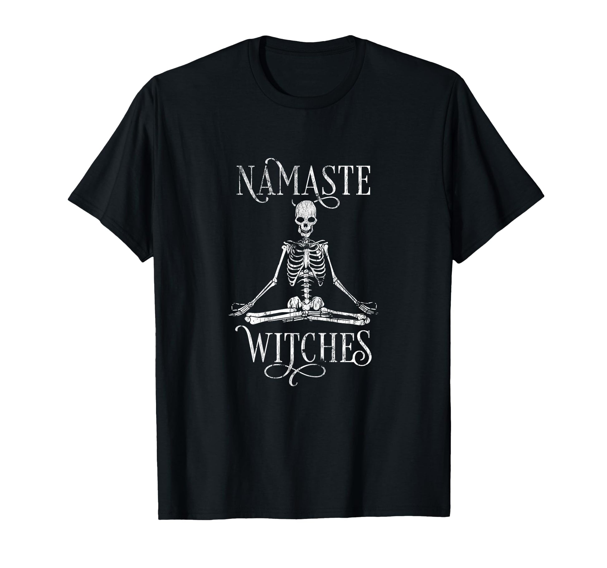 Womens Distressed Halloween Yoga Skeleton Namaste Witches T-Shirt